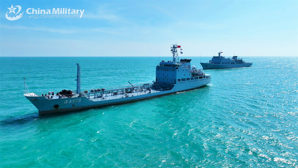NANSHUI 978 water tanker attached to a naval service ship group of the Chinese PLA Southern Theater Command sails at sea during a replenishment-at-sea training exercise on December 4, 2024. (eng.chinamil.com.cn/Photo by Wu Huanqing)