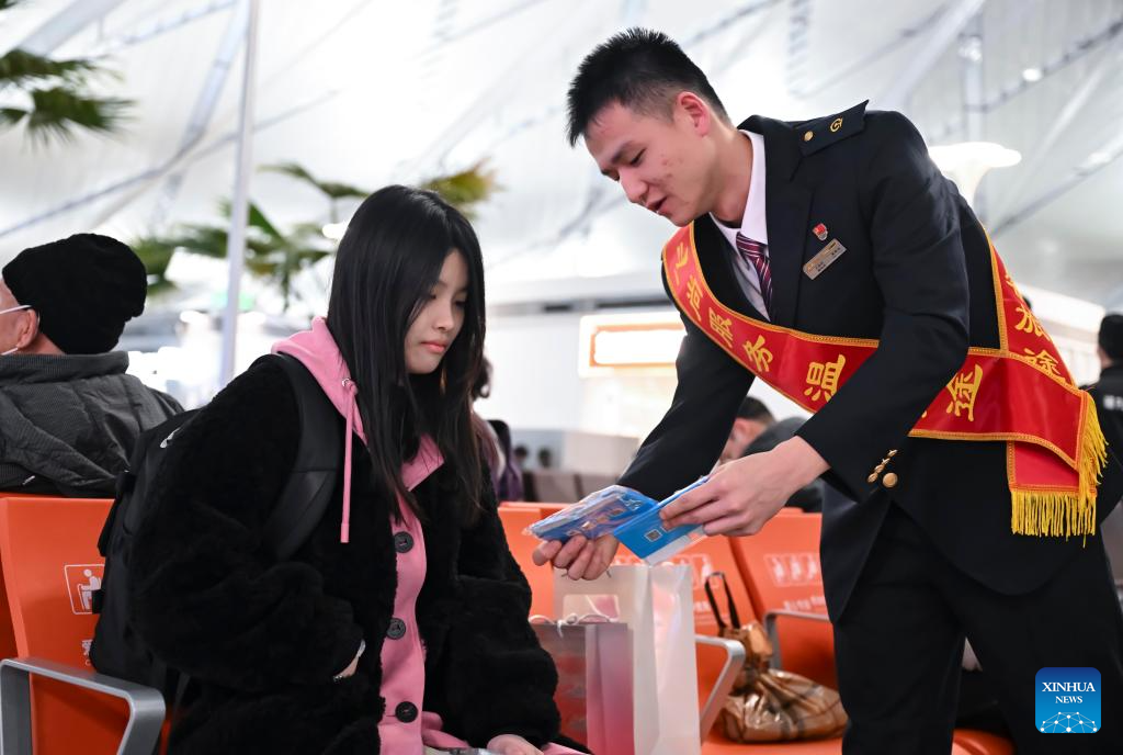 A staff member hands out a souvenir to a passenger who is about to take train G1305, the inaugural high-speed train service at Shanghai South Railway Station in east China's Shanghai, Jan. 5, 2025. Shanghai South Railway Station on Sunday launched its first high-speed rail service with the departure of the inaugural train G1305, marking a significant milestone in its development. (Photo by Chen Haoming/Xinhua)