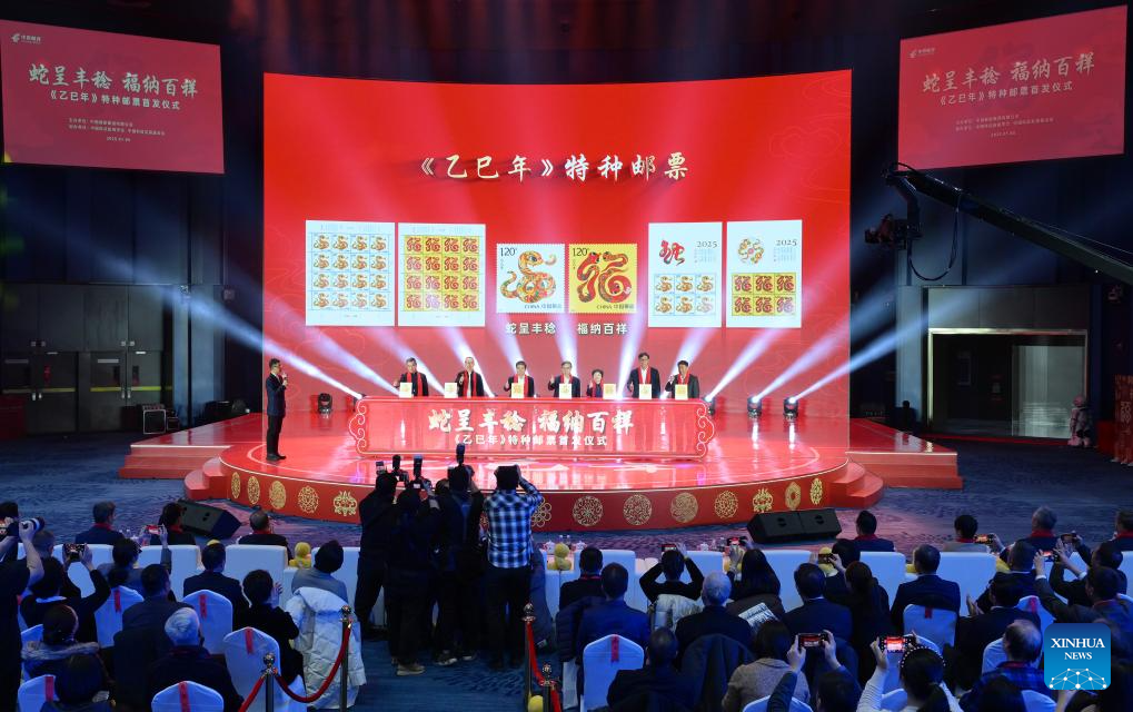 This photo taken on Jan. 5, 2025 shows the issuance ceremony of special stamps marking the Year of the Snake in Beijing, capital of China. China Post on Sunday unveiled a set of two special stamps to celebrate the upcoming Chinese zodiac Year of the Snake. (Xinhua/Li He)