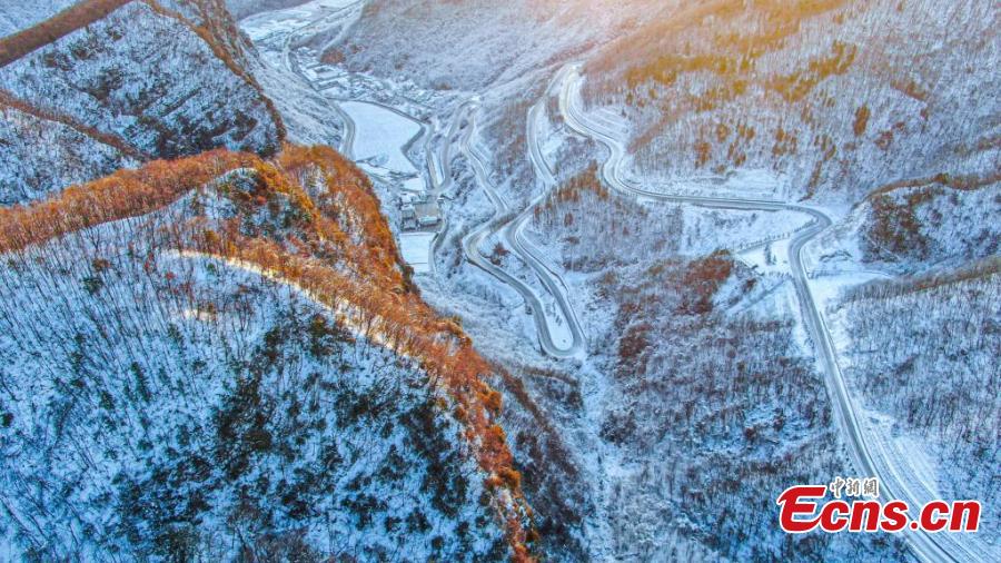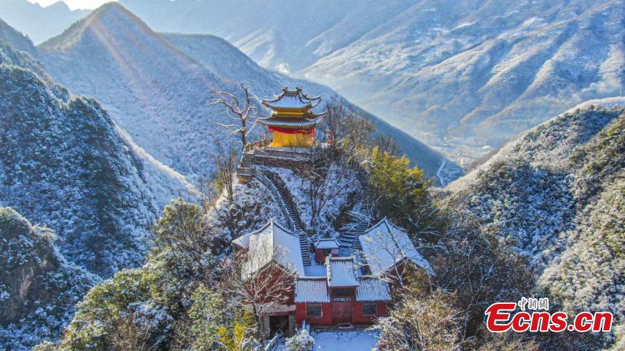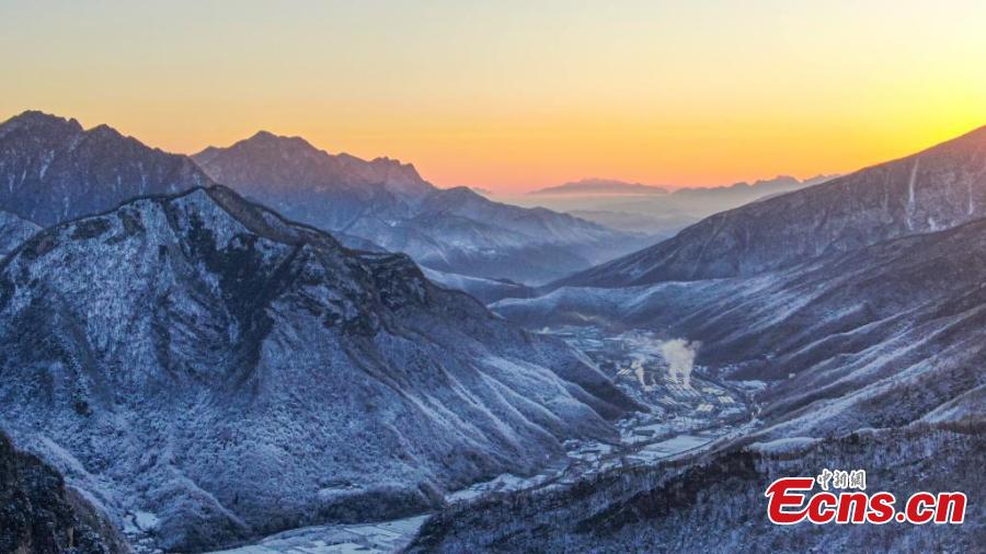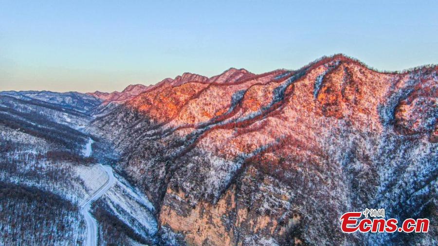 Sunlight bathes the peaks of snow-covered mountains in Shennongjia National Park, adding color to the snowy mountain in central China's Hubei Province, Jan. 5, 2024. (China News Service/Li Kaiyu)
