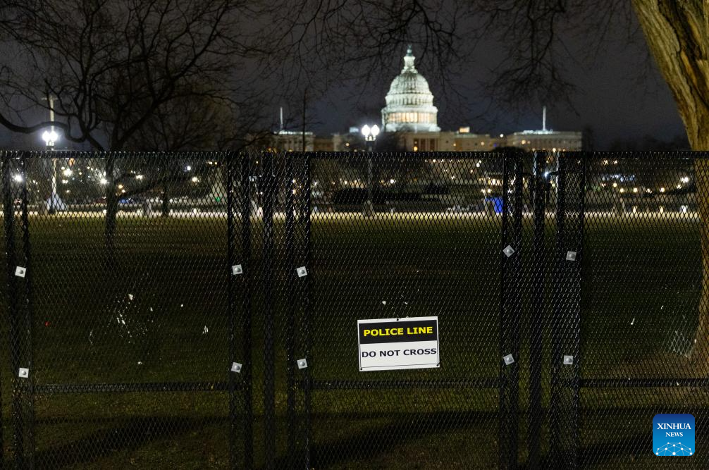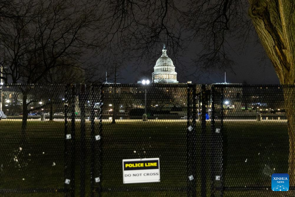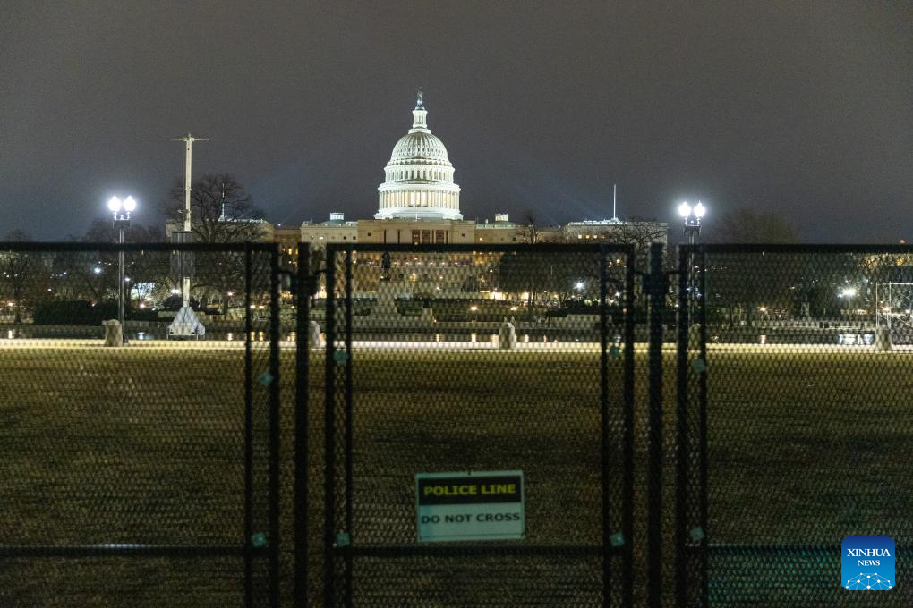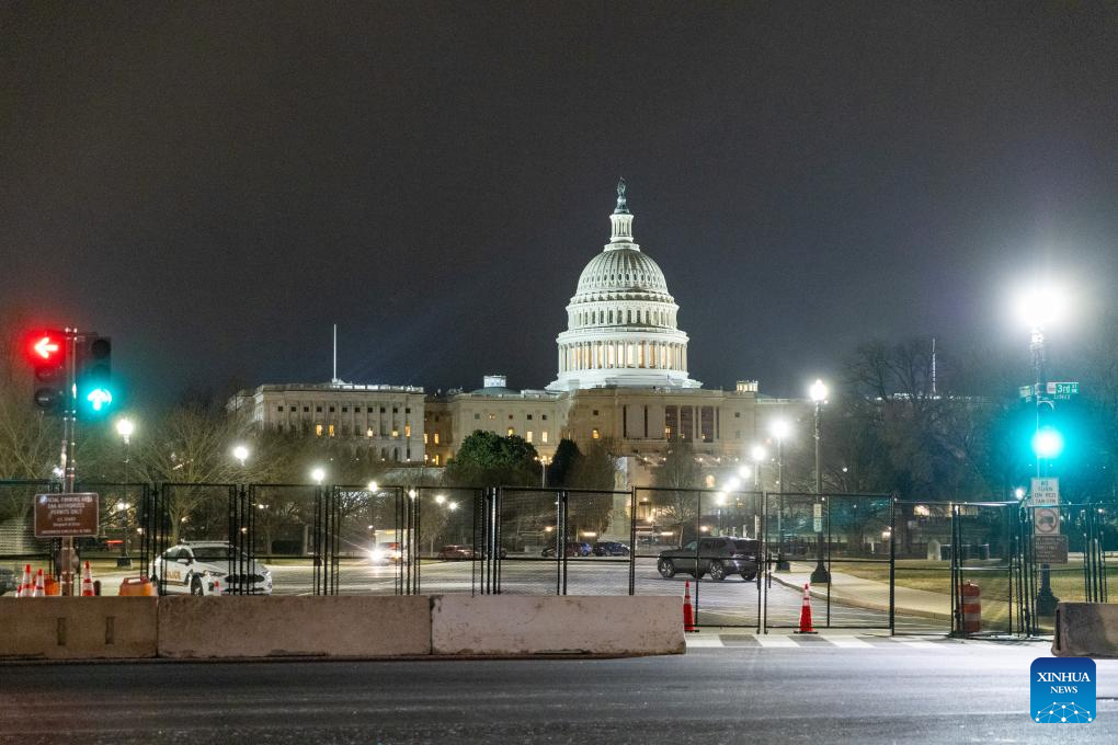 This photo taken on Jan. 5, 2025 shows the U.S. Capitol building encircled by security fencing in Washington, D.C., the United States. After the 2020 U.S. presidential election, then-President Donald Trump, a Republican, refused to concede to his Democratic opponent Joe Biden and repeatedly claimed that there was widespread election fraud. On Jan. 6, 2021, thousands of Trump supporters violently broke into the Capitol building, and interrupted the certifying process of the 2020 presidential election, prompting hundreds of lawmakers to evacuate in panic. (Xinhua/Hu Yousong)