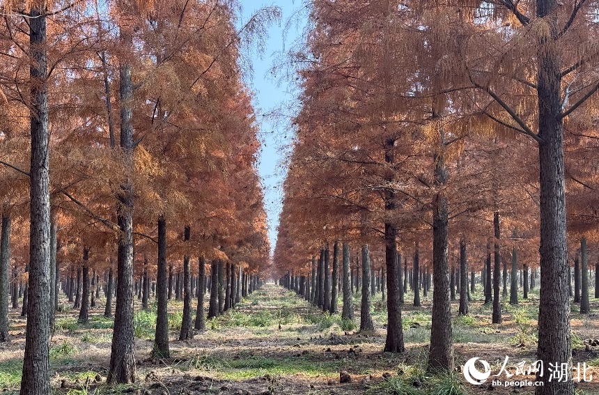 Photo shows a splendid winter view of over 500 mu (about 33.33 hectares) of cypress trees in Zhangdu Lake Wetland Nature Reserve, located in Xinzhou district of Wuhan, capital of central China's Hubei Province. (People's Daily Online/Wang Guoji)