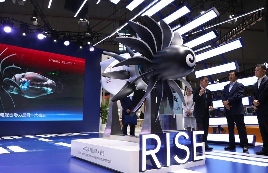 Visitors look at the RISE technology demonstrator program model at the exhibition area of General Electric during the seventh China International Import Expo (CIIE) in east China's Shanghai, Nov. 5, 2024. (Xinhua/Fang Zhe)