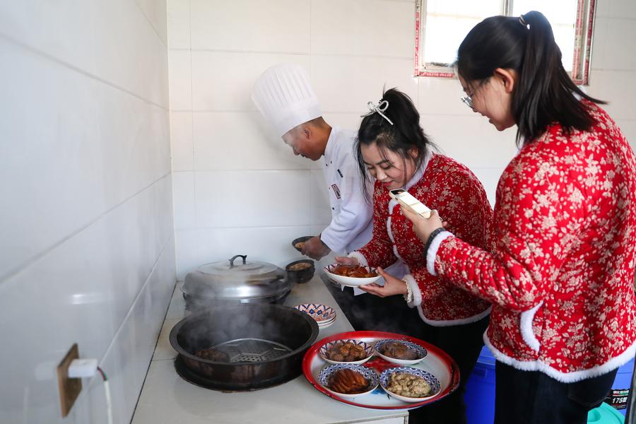 Members of a local e-commerce studio make videos of cooking local steamed dishes in Tangqi Village of Heshui County, Qingyang City, northwest China's Gansu Province, Jan. 5, 2025. (Xinhua/Lang Bingbing)
