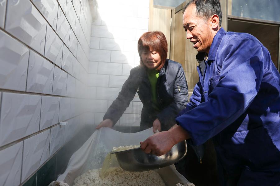 Villagers make tofu at a workshop in Tangqi Village of Heshui County, Qingyang City, northwest China's Gansu Province, Jan. 5, 2025. (Xinhua/Lang Bingbing)