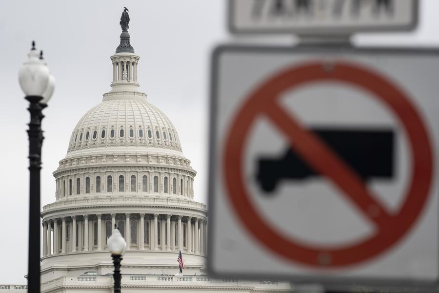 Photo taken on May 28, 2021 shows the U.S. Capitol building behind a traffic sign in Washington, D.C., the United States. (Xinhua/Liu Jie)