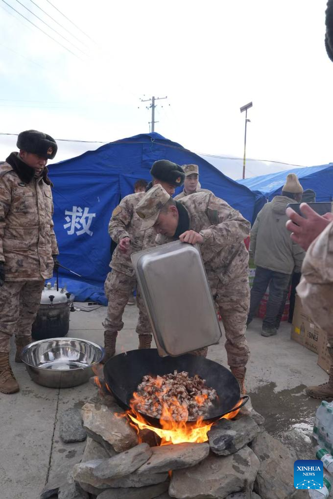 Rescuers prepare dinner at a village in Changsuo Township of Dingri County in Xigaze, southwest China's Xizang Autonomous Region, Jan. 7, 2025.