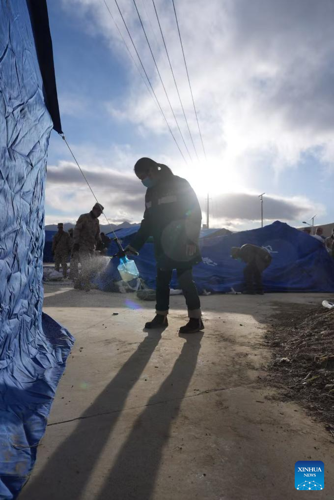 A staff member carries out disinfection at a village in Changsuo Township of Dingri County in Xigaze, southwest China's Xizang Autonomous Region, Jan. 7, 2025.