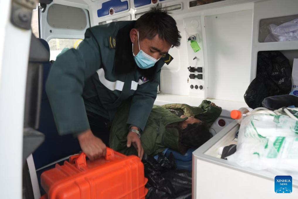 A staff member works in an ambulance at a village in Changsuo Township of Dingri County in Xigaze, southwest China's Xizang Autonomous Region, Jan. 7, 2025.