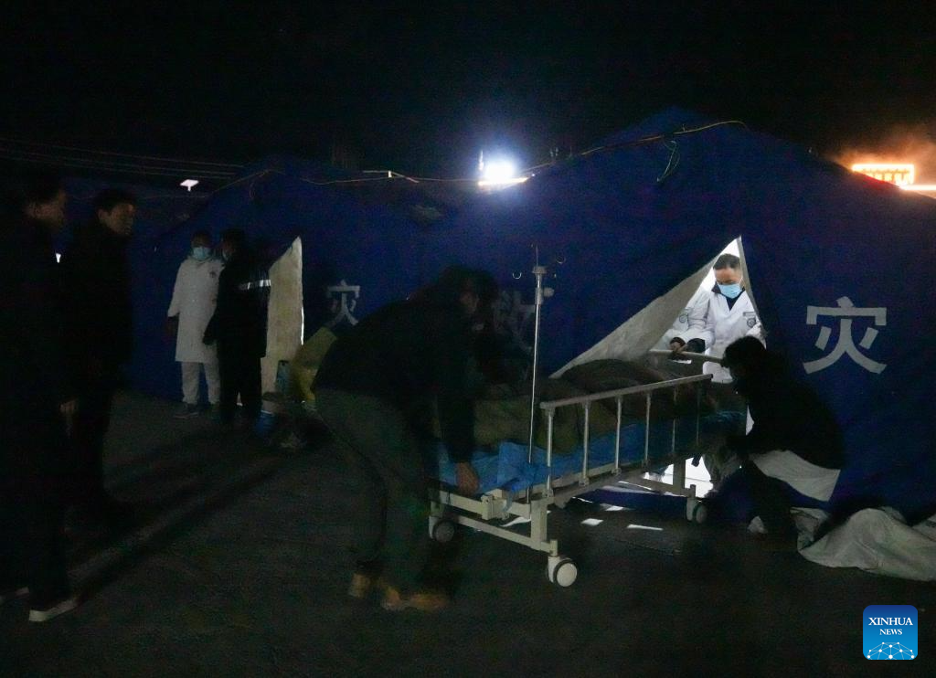 Medical workers treat people injured in the earthquake in tents set up at the People's Hospital of Dingri County in Xigaze, southwest China's Xizang Autonomous Region, Jan. 7, 2025. A total of 126 people have been confirmed dead and 188 others injured as of 7 p.m. Tuesday, after a 6.8-magnitude earthquake jolted Dingri County on Tuesday morning. (Xinhua/Ding Ting)