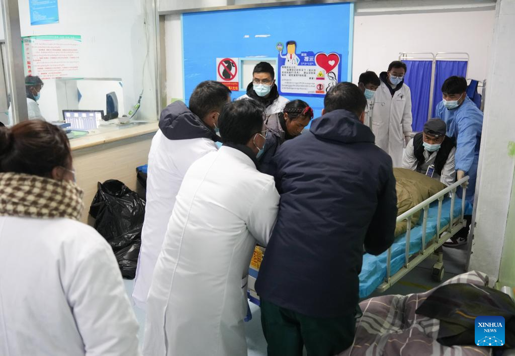 Medical workers treat people injured in the earthquake at the People's Hospital of Dingri County in Xigaze, southwest China's Xizang Autonomous Region, Jan. 7, 2025. A total of 126 people have been confirmed dead and 188 others injured as of 7 p.m. Tuesday, after a 6.8-magnitude earthquake jolted Dingri County on Tuesday morning. (Xinhua/Ding Ting)
