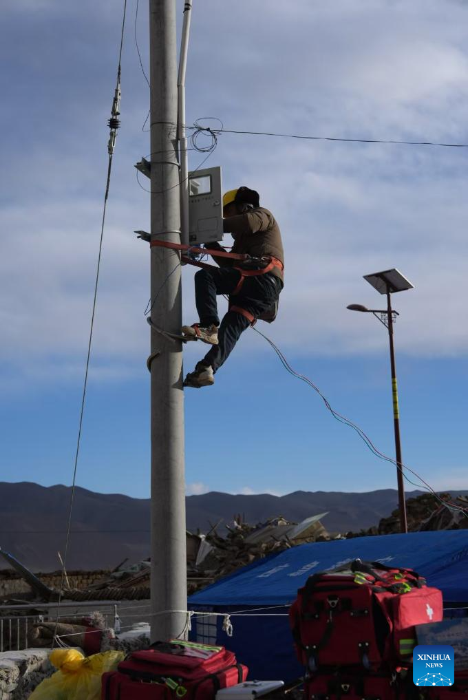 A staff member repairs electrical facilities at a village in Changsuo Township of Dingri County in Xigaze, southwest China's Xizang Autonomous Region, Jan. 7, 2025.