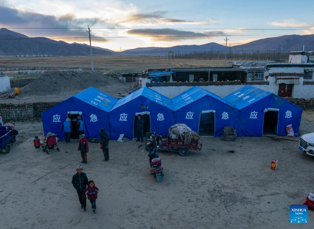 In this aerial drone photo, tents for earthquake-affected residents are pictured at a village in Lhaze County of Xigaze, southwest China's Xizang Autonomous Region, Jan. 7, 2025.
