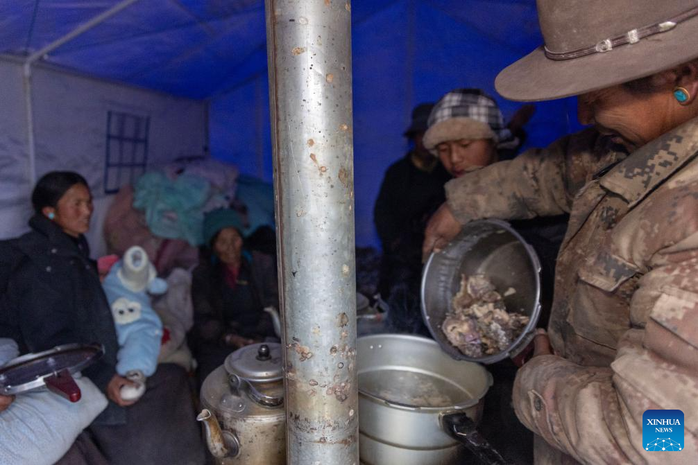 Earthquake-affected residents cook dinner in a tent at a village in Lhaze County in Xigaze, southwest China's Xizang Autonomous Region, Jan. 7, 2025.