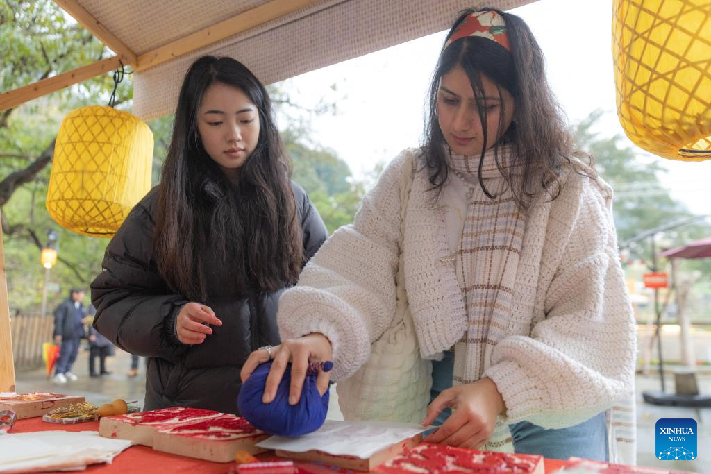 An international student makes a rubbing work in Pianyan ancient town, Beibei District, southwest China's Chongqing Municipality, Jan. 7, 2025. A group of international students attended a cultural event here on Tuesday to experience traditional Chinese culture. (Xinhua/Huang Wei)