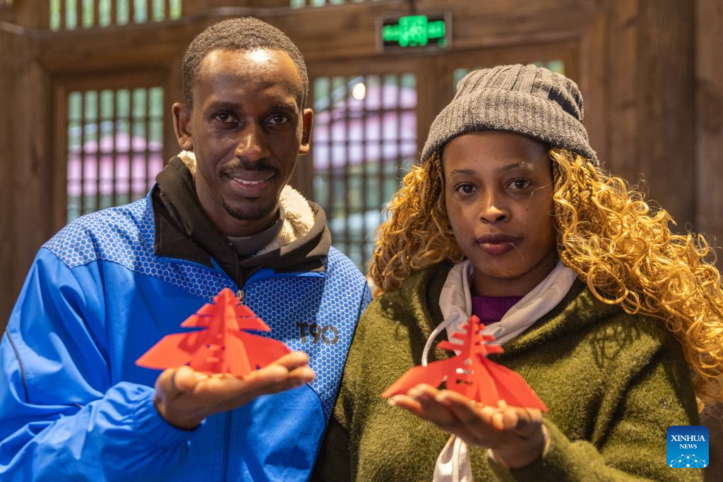 International students display paper-cutting works they made in Pianyan ancient town, Beibei District, southwest China's Chongqing Municipality, Jan. 7, 2025. A group of international students attended a cultural event here on Tuesday to experience traditional Chinese culture. (Xinhua/Huang Wei)