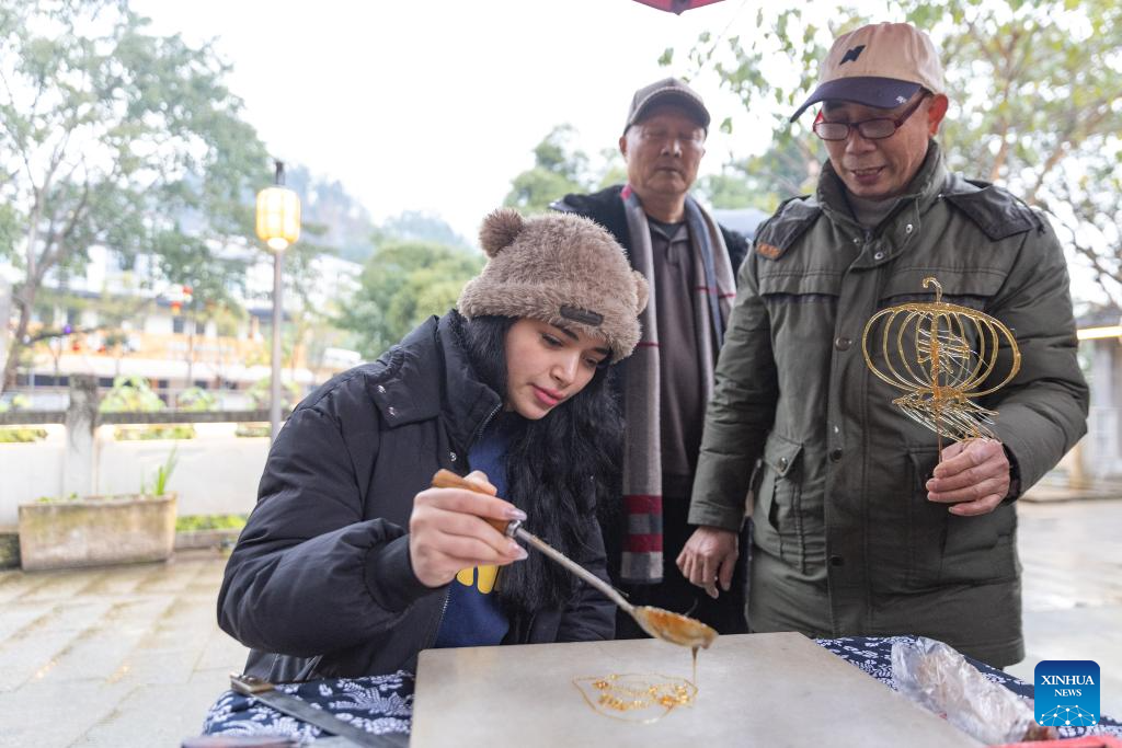 An international student tries to make sugar painting in Pianyan ancient town, Beibei District, southwest China's Chongqing Municipality, Jan. 7, 2025. A group of international students attended a cultural event here on Tuesday to experience traditional Chinese culture. (Xinhua/Huang Wei)