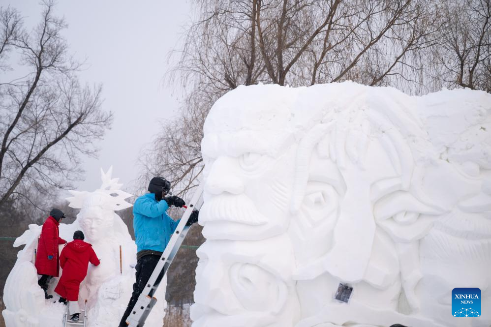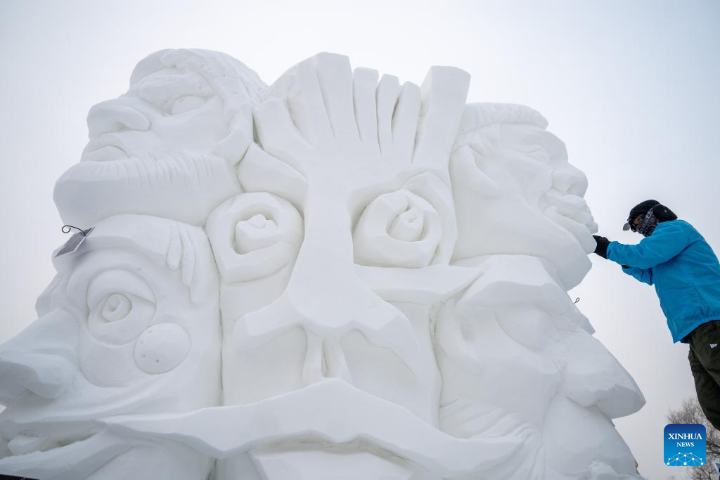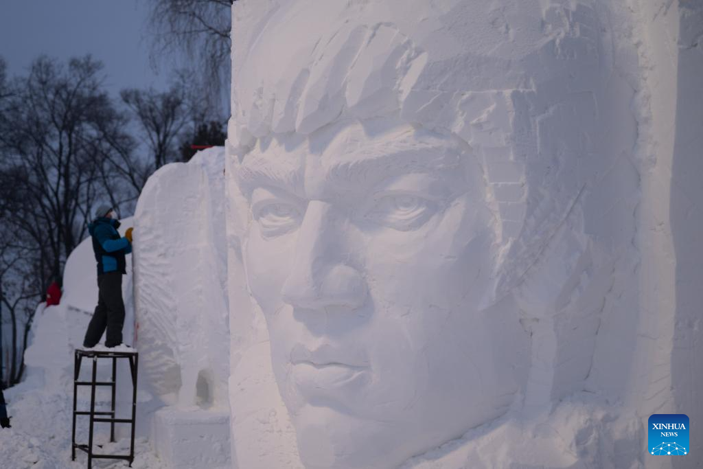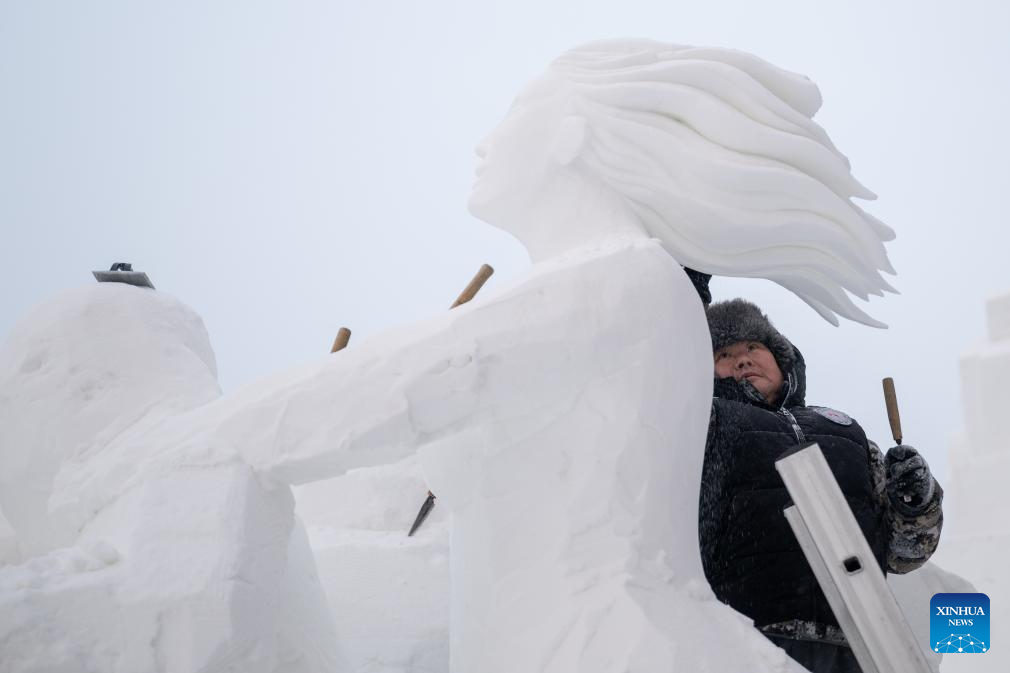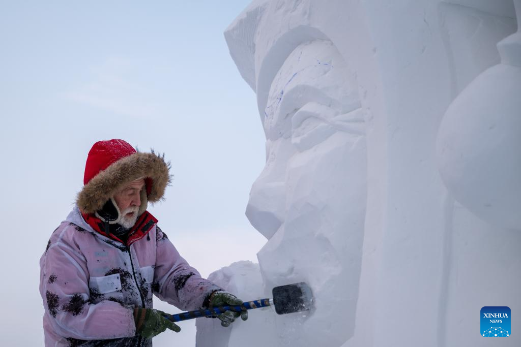 A contestant works on a snow sculpture at the Sun Island International Snow Sculpture Art Expo park in Harbin, northeast China's Heilongjiang Province, Jan. 7, 2025. The 27th Harbin international snow sculpture competition, attracting snow sculptors of more than 20 teams from 10 countries, entered its second competition day on Tuesday. Beautiful snow sculpture works have already taken shape after meticulous carving by snow sculpture artists. (Xinhua/Zhang Tao)