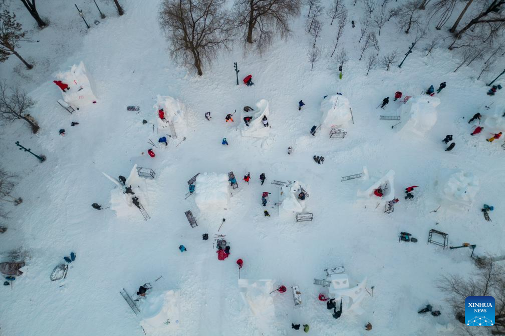 An aerial drone photo shows contestants working on snow sculptures at the Sun Island International Snow Sculpture Art Expo park in Harbin, northeast China's Heilongjiang Province, Jan. 7, 2025. The 27th Harbin international snow sculpture competition, attracting snow sculptors of more than 20 teams from 10 countries, entered its second competition day on Tuesday. Beautiful snow sculpture works have already taken shape after meticulous carving by snow sculpture artists. (Xinhua/Zhang Tao)