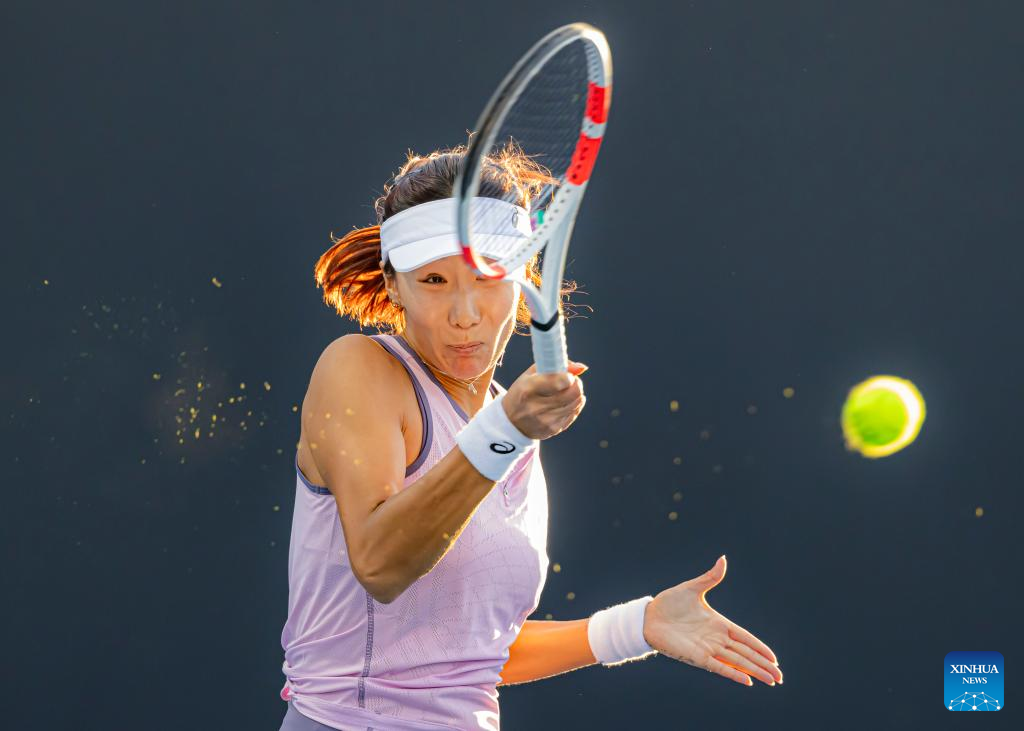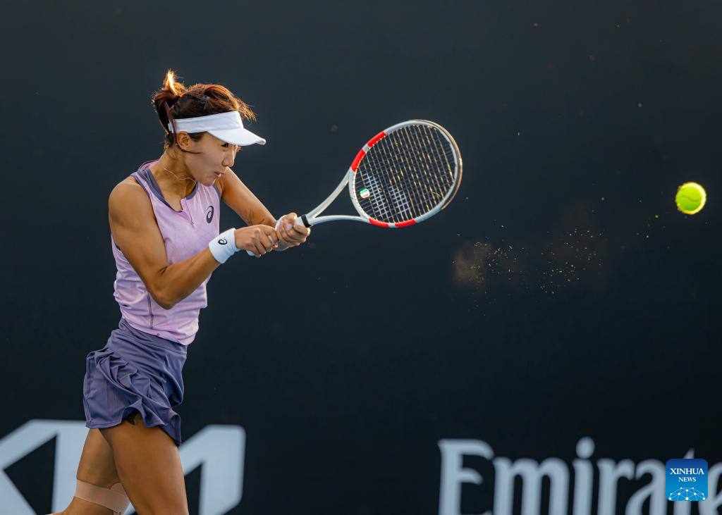 Gao Xinyu hits a return during the women's singles qualifying round 1 match between Gao Xinyu of China and Anouk Koevermans of the Netherlands at Australian Open tennis tournament in Melbourne, Australia, Jan. 7, 2025. (Photo by Chu Chen/Xinhua)