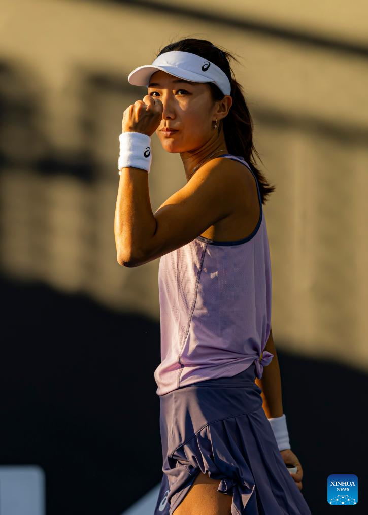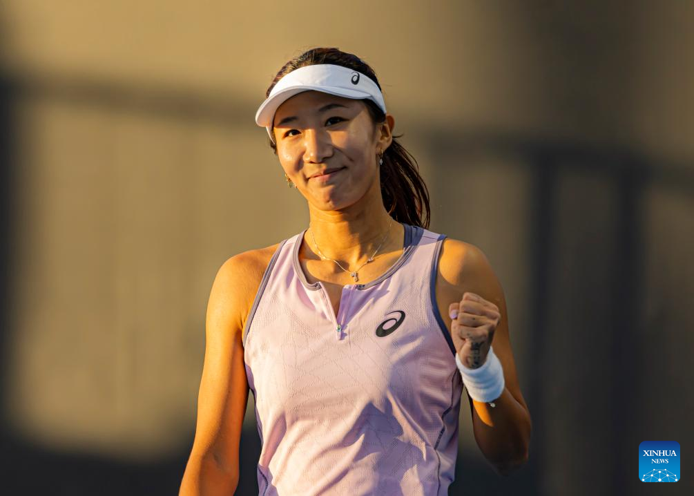 Gao Xinyu celebrates scoring during the women's singles qualifying round 1 match between Gao Xinyu of China and Anouk Koevermans of the Netherlands at Australian Open tennis tournament in Melbourne, Australia, Jan. 7, 2025. (Photo by Chu Chen/Xinhua)
