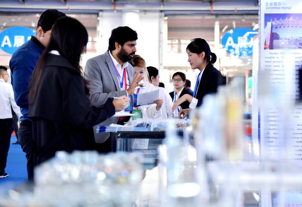 A buyer (middle) learns about fastener products at the 2024 China Yongnian International Sourcing Fair of Fasteners on Oct. 10, 2024. (Xinhua/Wang Xiao)