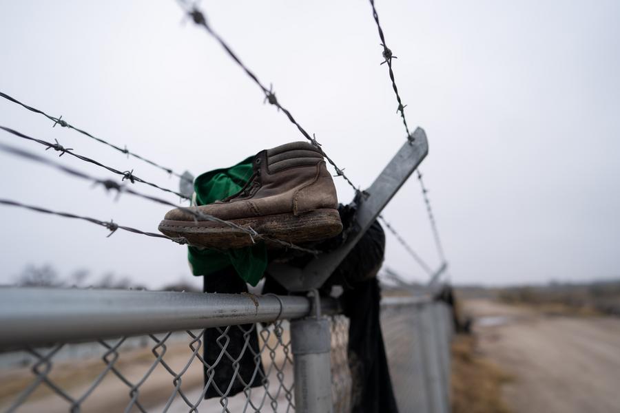 Shoes and clothing on the razor wire barriers are seen at the U.S.-Mexico border in Eagle Pass, Texas, the United States, Feb. 2, 2024. (Xinhua/Liu Jie)