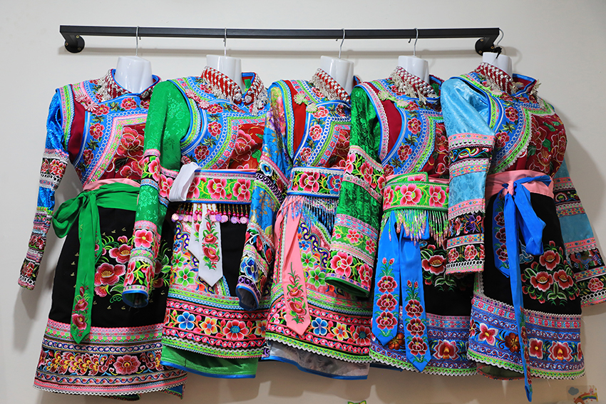 Li's store, covering about 50 square meters, welcomes guests with an array of intricately crafted ethnic garments representing diverse ethnic groups such as Yi, Miao, Bai, and Han. The walls are adorned with handcrafted items like embroidered shoes and bags.