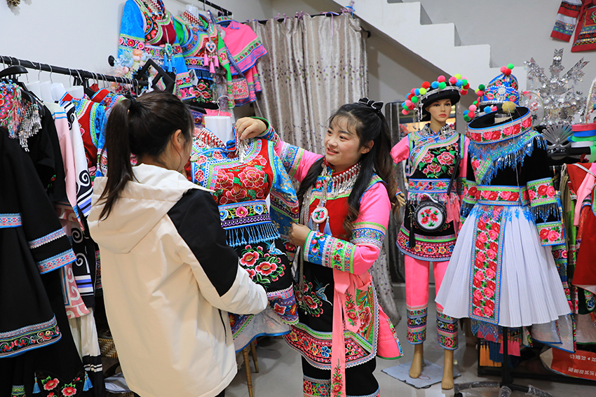 Li Jie shows an ethnic costume made by her to a customer in her store in Fuheng township, Yangbi Yi Autonomous County, Dali Bai Autonomous Prefecture, southwest China's Yunnan Province, on Dec. 20, 2024. (Photo/Yang Jiayan)