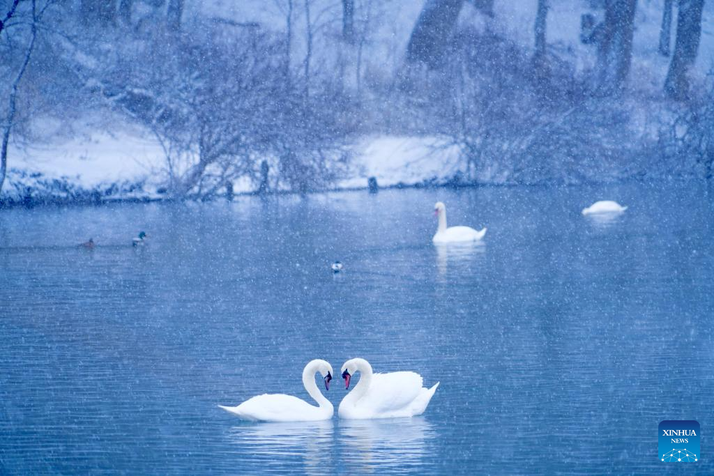 Swans are pictured in the Swan Spring Wetland Park in Yining County, northwest China's Xinjiang Uygur Autonomous Region, Jan. 8, 2025. (Xinhua/Du Juanjuan)