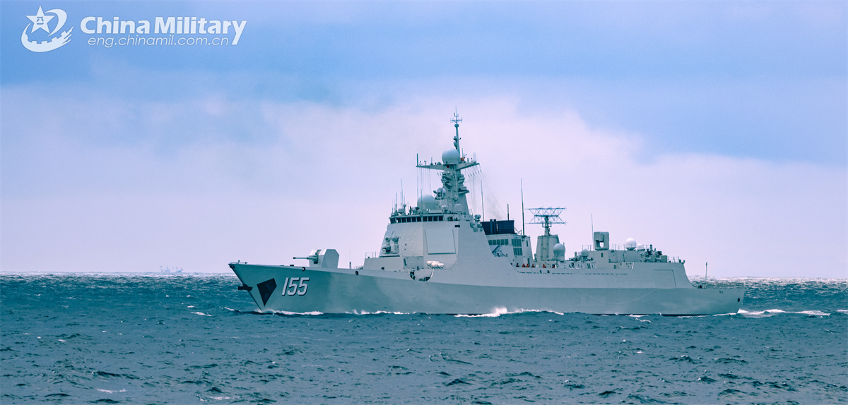 Type 052D guided-missile destroyer Nanjing (Hull 155) attached to a flotilla under the Chinese PLA Navy maneuvers to the designated training area on November 11, 2024. (eng.chinamil.com.cn/Photo by Wei Chenping)