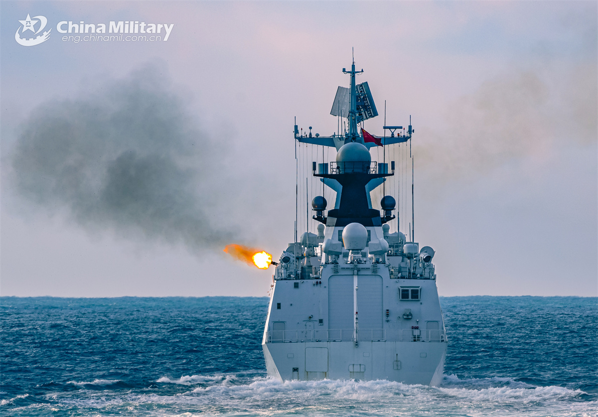 A Type 052D guided-missile destroyer attached to a flotilla under the Chinese PLA Navy fires its close-in weapon system at aerial targets during maritime training on November 11, 2024. (eng.chinamil.com.cn/Photo by Wei Chenping)