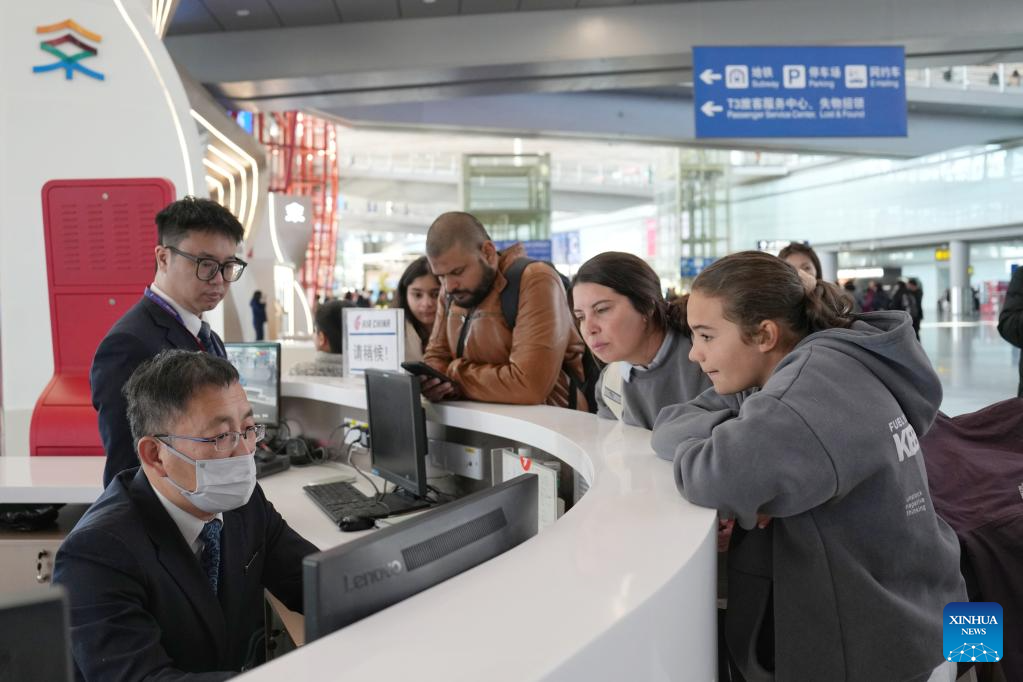 Staff members provide consultation services to passengers from Spain at a service center in Beijing Capital International Airport in Beijing, capital of China, Jan. 8, 2025.