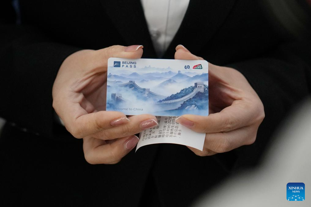A staff member displays the Beijing Pass card, a multi-purpose card designed to enhance convenience for international visitors by simplifying payments for transportation, tourist sites and shopping centers, at a service center in Beijing Capital International Airport in Beijing, capital of China, Jan. 8, 2025.