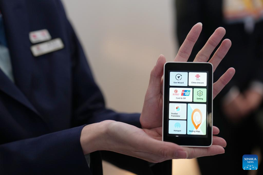 A staff member of China Unicom displays a portable device that can help international visitors to travel in China at a service center in Beijing Capital International Airport in Beijing, capital of China, Jan. 8, 2025.