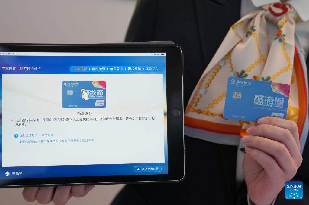 A staff member of Bank of Beijing displays a debit card for international visitors at a service center in Beijing Capital International Airport in Beijing, capital of China, Jan. 8, 2025.