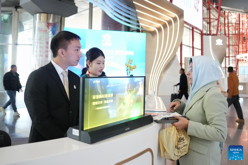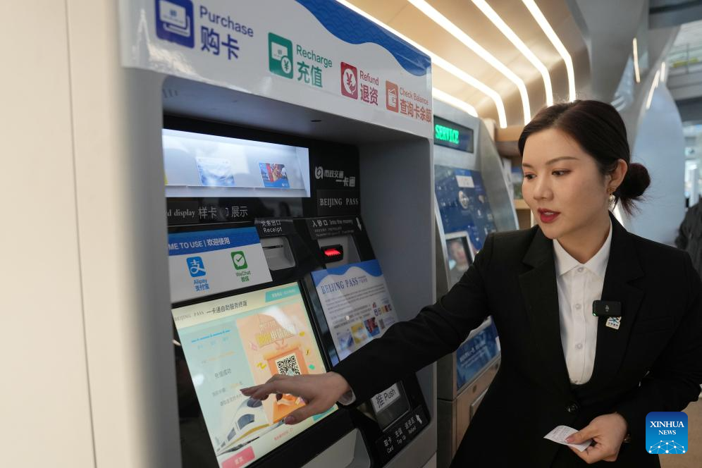 A staff member introduce recharging process of the Beijing Pass, a multi-purpose card designed to enhance convenience for international visitors by simplifying payments for transportation, tourist sites and shopping centers, at a service center in Beijing Capital International Airport in Beijing, capital of China, Jan. 8, 2025.