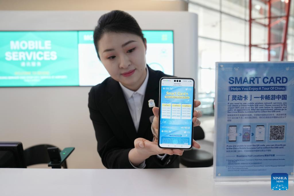 A staff member of China Mobile introduces a SIM card services designed for international visitors at a service center in Beijing Capital International Airport in Beijing, capital of China, Jan. 8, 2025.