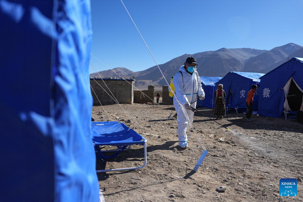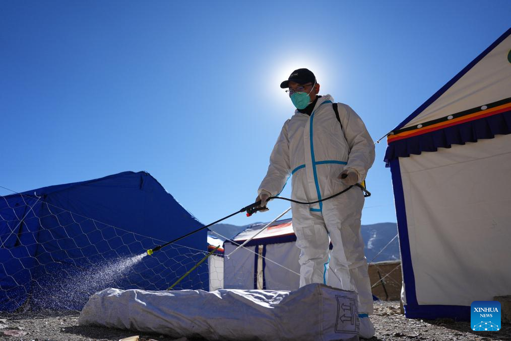 A medical worker carries out disinfection at a village in Dingri County in Xigaze, southwest China's Xizang Autonomous Region, Jan. 8, 2025. The search-and-rescue effort has entered its final stage after a 6.8-magnitude earthquake struck Dingri County in southwest China's Xizang Autonomous Region on Tuesday morning, the regional government said on Wednesday. The focus of work has shifted to the resettlement of quake-affected residents and post-disaster reconstruction, said Hong Li, head of the regional emergency management department at a press conference. (Xinhua/Jigme Dorje)