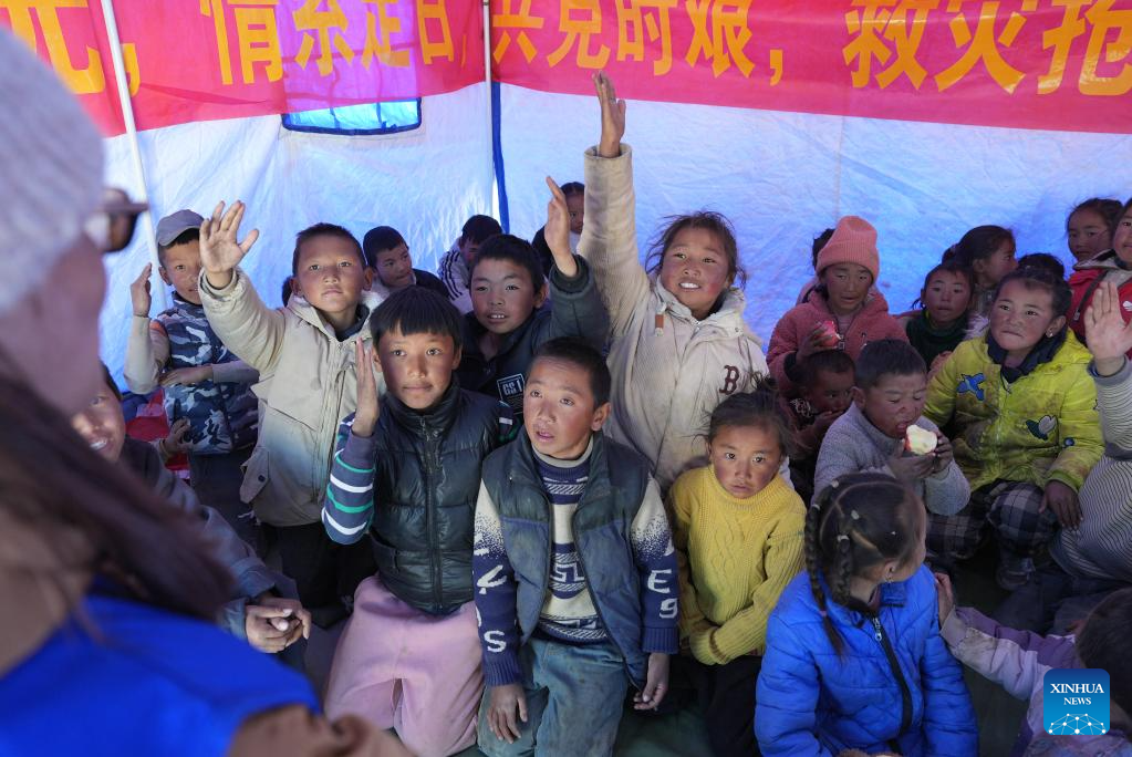 Children raise hands to answer questions during a psychology class given by a social work service center at a resettlement site of quake-affected residents in a village in Dingri County in Xigaze, southwest China's Xizang Autonomous Region, Jan. 8, 2025. The search-and-rescue effort has entered its final stage after a 6.8-magnitude earthquake struck Dingri County in southwest China's Xizang Autonomous Region on Tuesday morning, the regional government said on Wednesday. The focus of work has shifted to the resettlement of quake-affected residents and post-disaster reconstruction, said Hong Li, head of the regional emergency management department at a press conference. (Xinhua/Jigme Dorje)