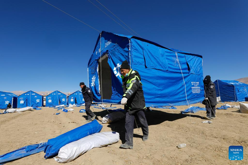 Rescuers set up a tent for quake-affected residents at a resettlement site in a village in Dingri County in Xigaze, southwest China's Xizang Autonomous Region, Jan. 8, 2025. The search-and-rescue effort has entered its final stage after a 6.8-magnitude earthquake struck Dingri County in southwest China's Xizang Autonomous Region on Tuesday morning, the regional government said on Wednesday. The focus of work has shifted to the resettlement of quake-affected residents and post-disaster reconstruction, said Hong Li, head of the regional emergency management department at a press conference. (Xinhua/Shen Bohan)
