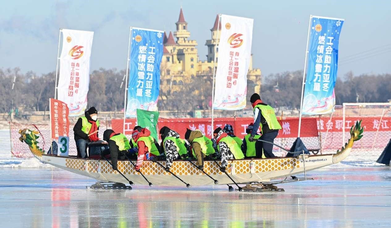 A dragon boat race is held on the frozen Songhua River in Harbin, northeast China's Heilongjiang province, Dec. 22, 2024. (People's Daily Online/Wang Debin)