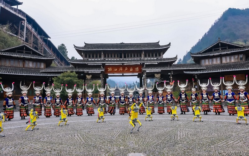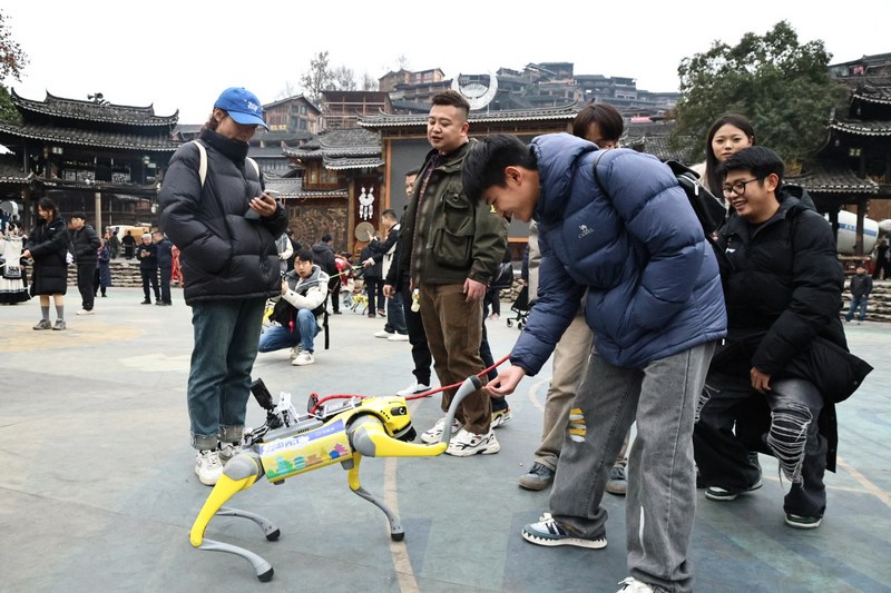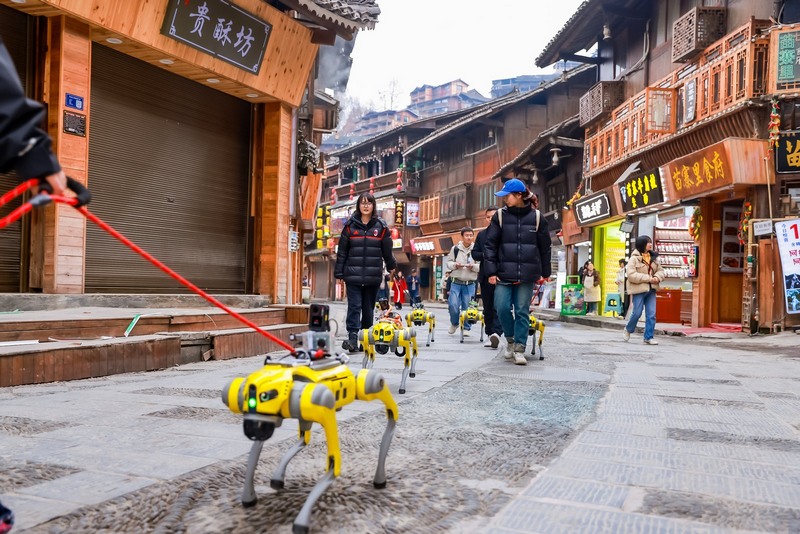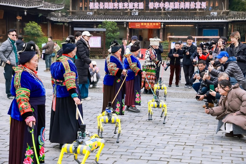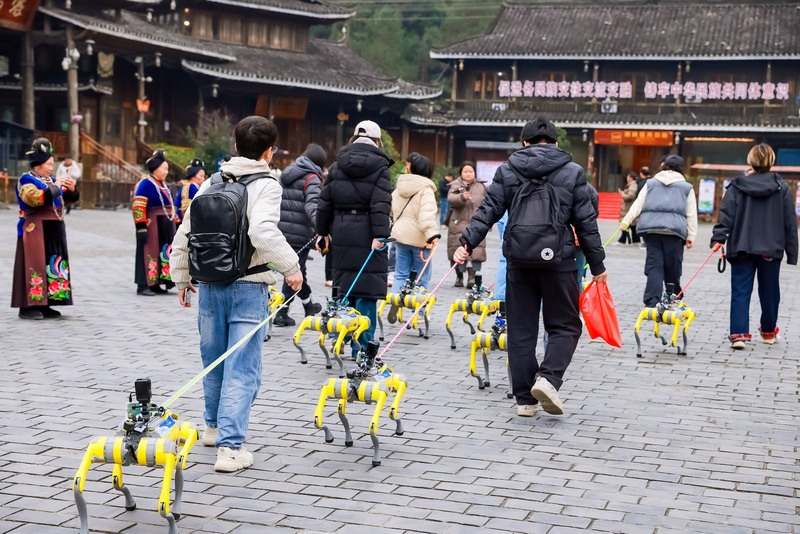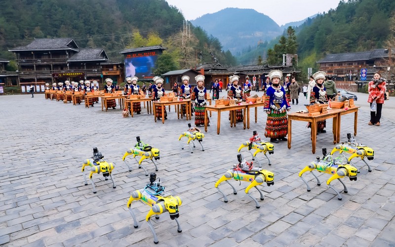 As the world's largest Miao ethnic community, the Xijiang Qianhu Miao Village is celebrated for its unique architectural style, vibrant folk activities, and deep cultural roots. The addition of AI robot dogs has added a modern technological twist to the village, seamlessly blending tradition with innovation and enhancing its appeal to tourists.