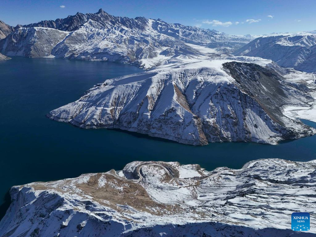 An aerial drone photo taken on Jan. 8, 2025 shows a lake and surrounding snow mountains in Taxkorgan Tajik Autonomous County, northwest China's Xinjiang Uygur Autonomous Region. (Xinhua/Hu Huhu)
