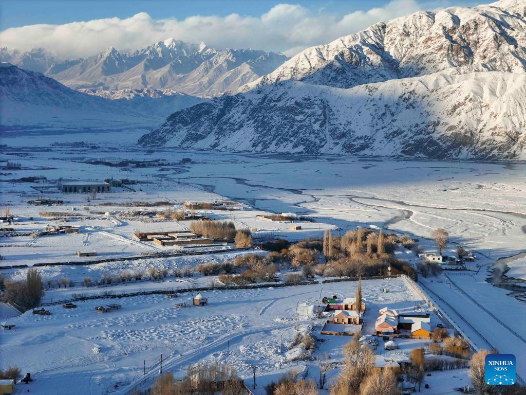 An aerial drone photo taken on Jan. 8, 2025 shows a village in Taxkorgan Tajik Autonomous County, northwest China's Xinjiang Uygur Autonomous Region. (Xinhua/Hu Huhu)