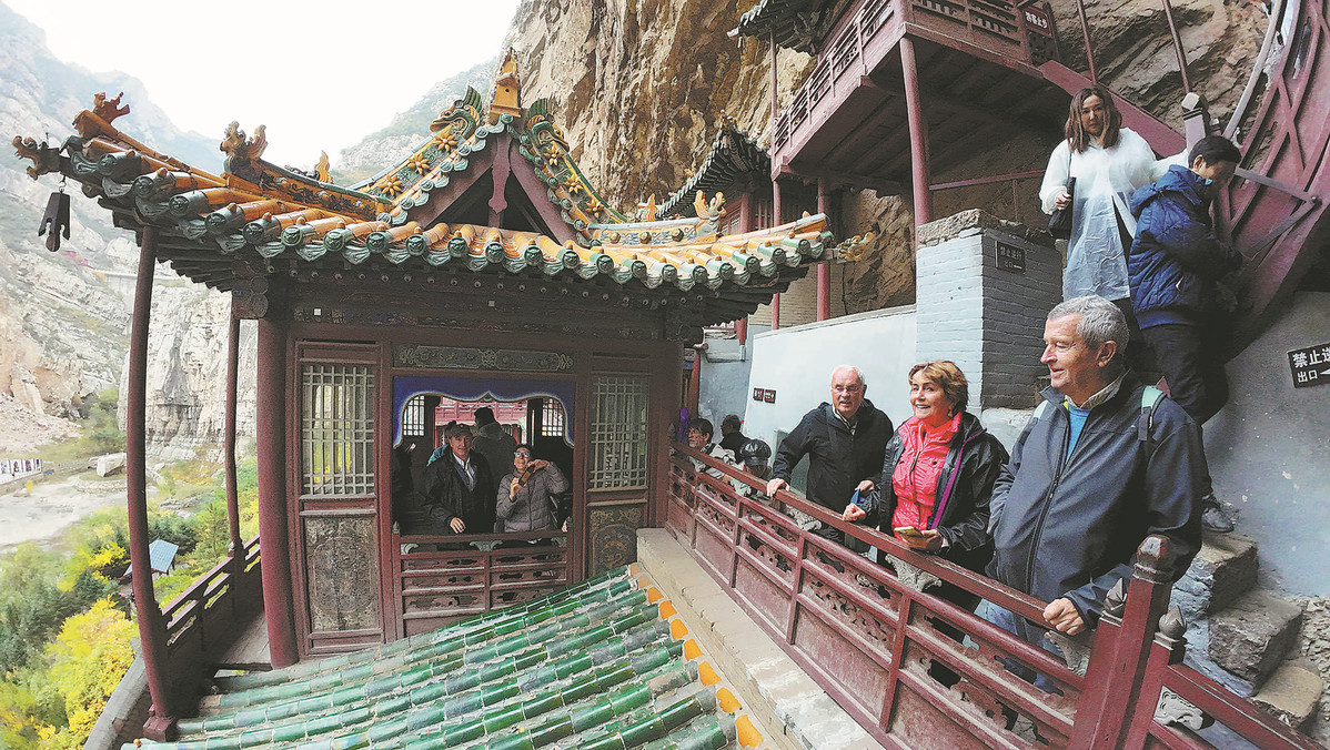 Foreign tourists visit the Xuankong (Hanging) Temple in Hunyuan county, Shanxi province. (Zhu Xingxin/China Daily)