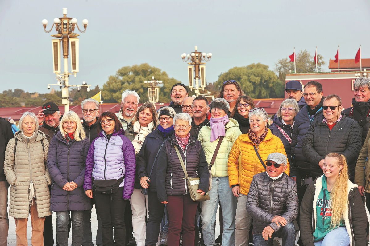 Foreign tourists take a group photo at Tian'anmen Square in Beijing on Nov 23. (Photo/China Daily)