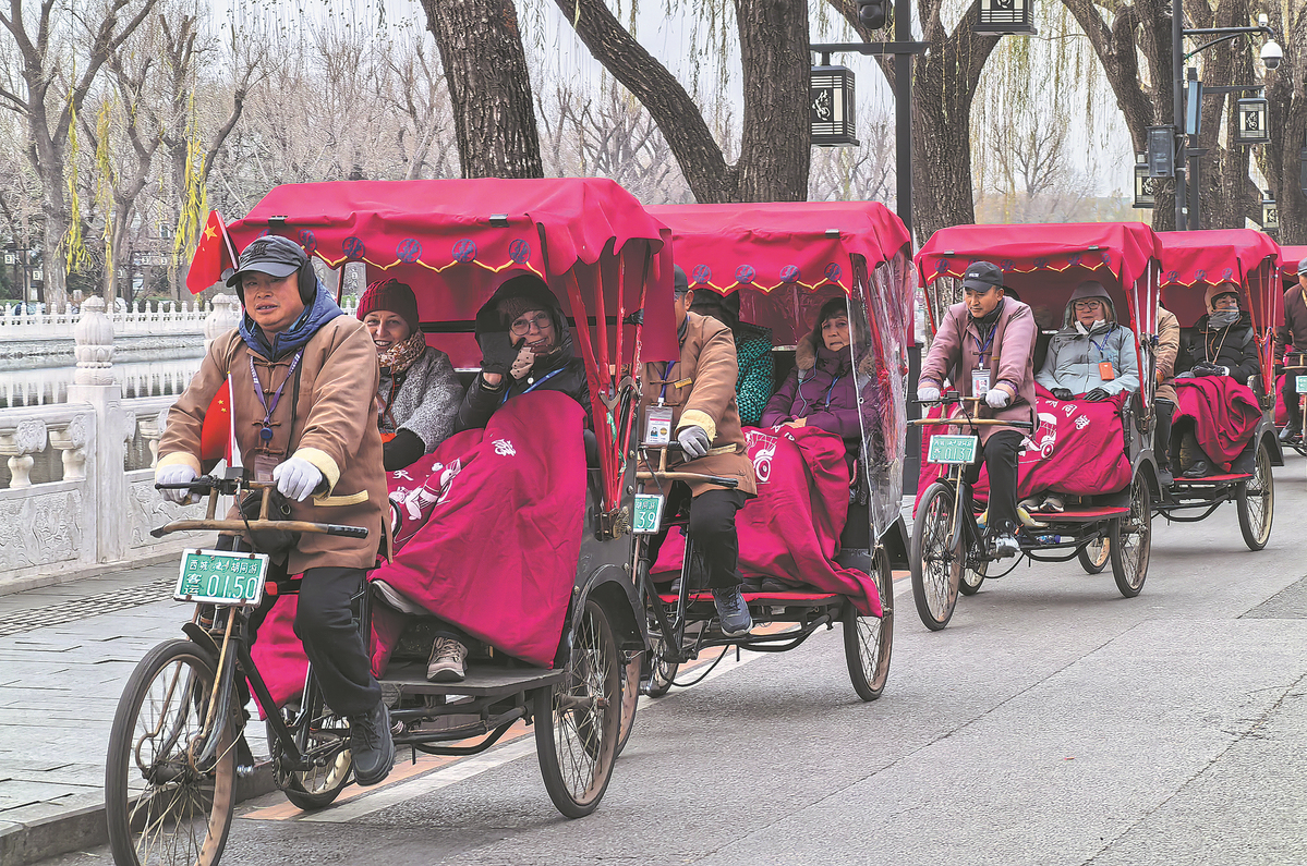Foreign visitors take guided tricycle tours in Beijing on Dec 12. (Ju Huanzong/Xinhua)