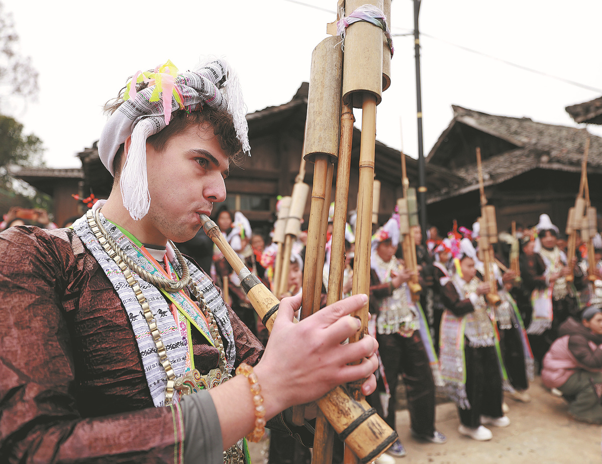 A foreign visitor plays a lusheng (reed pipe) together with villagers of the Miao ethnic group in Congjiang county, Guizhou province, on Dec 20. (Photo/China Daily)