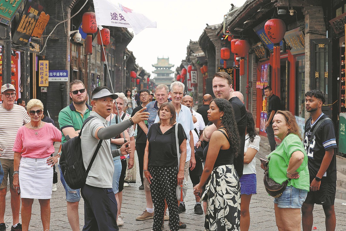 A tour guide introduces Pingyao Ancient City in Shanxi province to a group of foreign visitors on Sept 3. (Zhu Xingxin/China Daily)